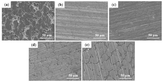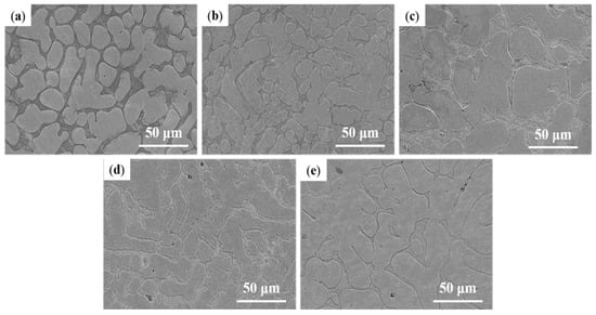 The SEM images of the FeCrMnxAlCu HEAs: (a) x = 0, (b) x = 0.5, (c) x = 1.0, (d) x = 1.5, (e) x = 2.0.