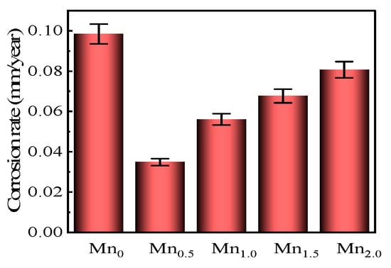 where ΔW is the mass loss of the specimen before and after corrosion (g), t is the immersion time in the corrosion solution (h), A is the surface area of the specimen exposed to the surface of the corrosion solution (cm2), and D is the density of the specimen (g/cm3), which was obtained by Archimedes’ law measurement. The figure shows that the corrosion rate was higher (0.0984 mm/y) when x = 0. However, when the Mn content was slightly increased to x = 0.5, the corrosion rate considerably decreased to 0.0349 mm/y, at which point, the corrosion resistance of the alloy was optimized. However, with an additional increase in Mn content, the corrosion rate gradually increased.