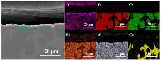Figure 8 shows the cross-sectional SEM and EDS images of the FeCrMn0.5AlCu HEAs after immersion in 1 M NaOH for 168 h. The SEM images demonstrate corrosion-induced microstructural changes, including the formation of surface craters and pores. The EDS analyses show the distribution of elemental oxygen over the alloy surface, indicative of the formation of an oxide layer. The differences in the chemical composition and microstructure of the different phases led to their corresponding corrosion behavior. After corrosion, dendritic regions were enriched with Fe, Cr, and Mn, whereas interdendritic regions contained Cu, which contributed to the difference in the corrosion resistance of the alloys with the dendritic and interdendritic regions in corrosive media.