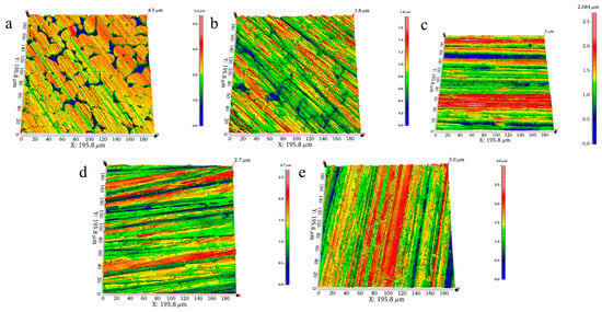 Three-dimensional images of the surface of FeCrMnxAlCu HEAs after immersion: (a) x = 0, (b) x = 0.5, (c) x = 1.0, (d) x = 1.5, (e) x = 2.0.