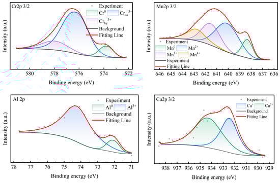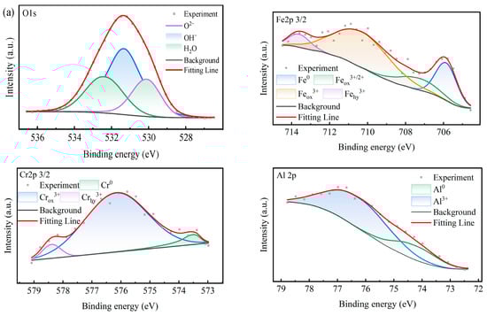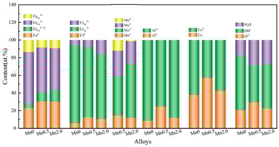 Figure 11 shows the atomic percentages of metallic and oxide/hydroxide phases in HEA surfaces with different Mn contents. The chemical valence distribution on the surface of the alloys changed with increasing Mn content. In the Mn0.5 alloy, the metal state contents of Fe, Cr, and Al were higher, indicating that these elements primarily existed in the pristine metallic form, which was conducive to the improvement of the corrosion resistance of the alloy. The content of Cu2O was higher than that of CuO, and the contents of Fe3O4 and Cr2O3 were also higher, indicating that a more stable passivation layer was formed in the Mn0.5 alloy. Moreover, the multivalent distribution of Mn contributed to the formation of a complex and stable oxide structure. The presence of O2− and water molecules in the passivation layer helped to enhance its stability. Consequently, the Mn0.5 alloy exhibited better corrosion resistance in a 1 M NaOH solution than other alloys.