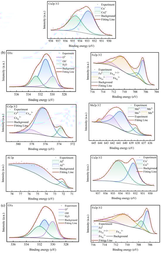 High-resolution spectroscopy of FeCrMnxAlCu HEAs after corrosion: (a) x = 0, (b) x = 0.5, (c) x = 2.0.