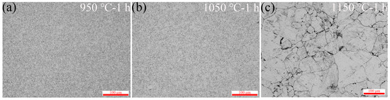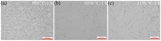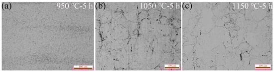 Figure 2, Figure 3, Figure 4, Figure 5, Figure 6 and Figure 7 display the optical micrographs of the samples after being pseudo-carburized at 950 °C, 1050 °C, and 1150 °C for 0.5 h, 1 h, and 5 h, which show that the average grain size of the prior austenite gradually grow with the temperature increasing. At 950 °C, the mean size of the prior austenite grains (PAGs) in the C0 steel is 11.6 μm (Figure 2a, Figure 3a and Figure 4a), a little larger than that in the C1 steel (11.0 μm) (Figure 5a, Figure 6a and Figure 7a). And the PAGs are closed to the homogeneous microstructure. Abnormal grain growth can be observed at 1050 °C in the C0 steel, and the amount of the abnormally grown PAGs decreases with the time increasing, indicating the fine grains coarsen with the time being prolonged. At 1050 °C, normal coarsening grains occurred in C1 steel after being pseudo-carburized for 5 h, and the mean size of the PAGs is 38.7 μm, much larger than those for 0.5 h and 1 h. In addition, abnormal grain growth can be observed at 1150 °C in C1 steel. The results indicate that coarsening temperatures of the two steels after pseudo-carburizing for 0.5 h, 1 h, and 5 h are the same, but the coarsening time improved by about 4 h in C1 steel. Similarly, the average grain size is obviously reduced in C1 steel.