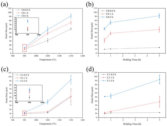 Figure 8 shows the evolution of prior austenite grain size with temperature and time in the two steels. It is clear that the mean sizes of the PAGs in the C1 steel are smaller than those in the C0 steel under the same heat treatment. In addition, it can be found that the temperature of the heating treatment has a greater impact on the growth of the PAGs in the two steels. The growth rates of the grain size are relatively higher with the increase in temperature (Figure 8a,c) than those with the increase in time (Figure 8b,d). Moreover, the grain size of C0 steel increases linearly with the temperature, while the grain growth rate in the C1 steel is slow first, and fast afterwards. To sum up, the C1 steel has a better performance in the resistance to coarsening under high-temperature heat treatment compared to the C0 steel. It is also suggested that the different precipitated particles which exist in the matrix in the two steels will lead to the difference in the growth patterns of the PAGs. The effect of the characteristics of the precipitated particles on the growth of austenite grains deserves further research.