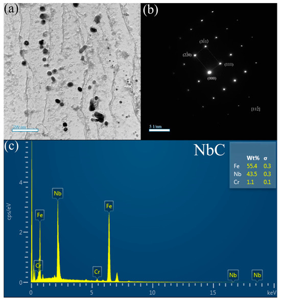 Determination of the precipitated particles in the C1 steel after pseudo-carburization at 1050 °C for 0.5 h: (a) TEM micrograph (BF), (b) NbC precipitate’s SAED pattern, and (c) EDS corresponding to the precipitated particle in (a).