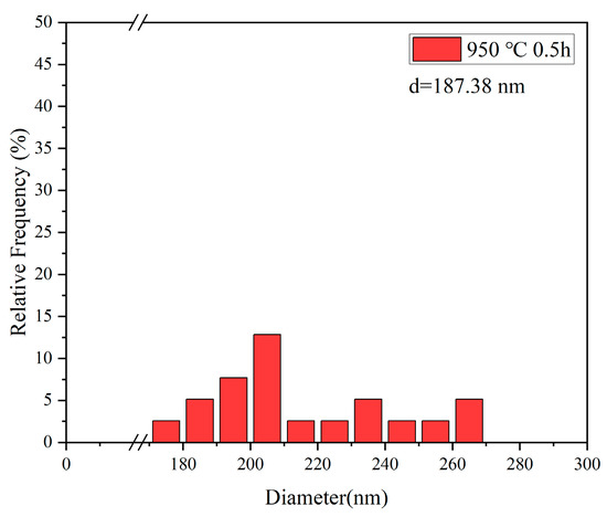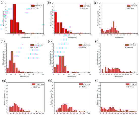 where LA and LB are the measured edge sizes of the AlN-precipitated particles. The size statistics of the NbC-precipitated particles in the C1 steel are shown in Figure 12. It is clear that the average diameter of the NbC-precipitated particles also increases with the temperature and holding time increasing. After holding for 0.5 h and 1 h at 950 and 1050 °C, the average diameters of the NbC particles are small, and few number of large NbC particles can be found. Nevertheless, as the holding time is prolonged, the peak of the grain size distribution of the precipitated particles gradually shifts to the right. The coarsening NbC particles play a more crucial role with the pseudo-carburization time prolonging. At 1150 °C, the size of most of the precipitated particles after being held for 0.5 h and 1 h is 100 nm and 140 nm, respectively. When the holding time is prolonged to 5 h, the size distribution tends to be equal. With a decrease in small-sized precipitated particles and an increase in large-sized precipitates, the size of the precipitated particles is inclined to increase to an average size. Moreover, the increase in the average grain size of the precipitated particles is also greatly influenced by the pseudo-carburization temperature. When the holding time is 0.5 h and the temperature increases from 950 °C to 1150 °C, the average grain size of NbC increases from 13.49 nm to 128.07 nm.