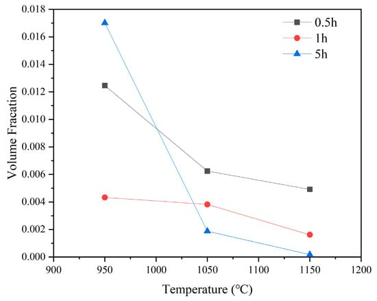 where N is the number of precipitated particles in the selected area, S is the value of the selected area, and D is the equivalent diameter of the precipitated particles. It can be found that, when the holding time is 0.5 h and 1 h, although the grain size of the precipitated particles increases, the volume fraction decreases as the temperature and time increase. The reduction of the nano-scale carbide particles shows that some nano-scale carbide precipitated particles have dissolved during the pseudo-carburization treatment. Thus, it indicated that the NbC-precipitated particles in large quantities dissolve with the pseudo-carburization temperature and time increasing. Meanwhile, the dissolution of the NbC-precipitated particles gradually prospered with the pseudo-carburization temperature and time increasing. However, when the holding time is 5 h, the volume fraction increases or even exceeds the value when being held for 0.5 h. It demonstrated that, when the holding time is extended from 1 h to 5 h, the dissolution of the NbC-precipitated particles decreases or stops. However, there is a drastic decrease in the volume fraction of the NbC-precipitated particles which occurred in the C1 steel after pseudo-carburization at 1050 °C for 5 h. At this point, the PAGs in the C1 steel undergo coarsening. The drastic decrease in the volume fraction may be the main reason for the growth of the PAGs in the C1 steel.