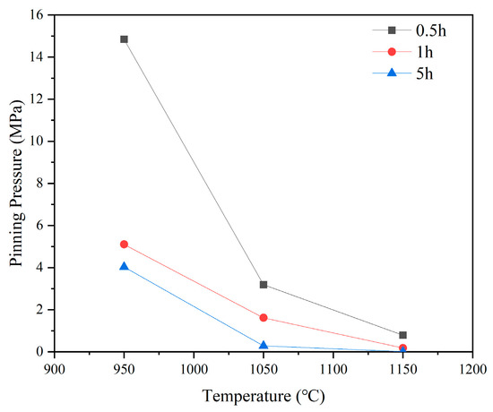 It can be found that the pinning pressure decreases with the temperature and holding time increasing. At 950 °C, the pinning pressure of the NbC-precipitated particles in the C1 steel held for 0.5 h reaches 14.84 MPa, which can effectively pin the austenite grain boundaries and hinder the austenite grain growth. As the holding time is prolonged, the pinning pressure decreases, reaching 5.10 MPa at 1 h and 4.03 MPa at 5 h, gradually losing its pinning effect on the grain boundaries. Consistent with the growth line of 950 °C, the pinning pressures at 1050 °C and 1150 °C decrease with the holding time increasing. However, the pinning pressures at 1150 °C held for 0.5 h and at 1050 °C held for 5 h are 0.79 MPa and 0.27 MPa, respectively, where the pinning effect on the grain boundaries is very slight.
