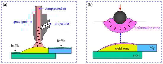 - Li, R.; Yuan, X.J.; Hong, M.; Tao, S.W.; Chen, Z.; Wang, G. Effect of High Energy Shot Peening on the Microstructure and Mechanical Property of AZ31B Mg Alloy/HSLA350 Steel Lap Joints. Int. J. Precis. Eng. Manuf. 2021, 22, 831–841. [Google Scholar] [CrossRef]