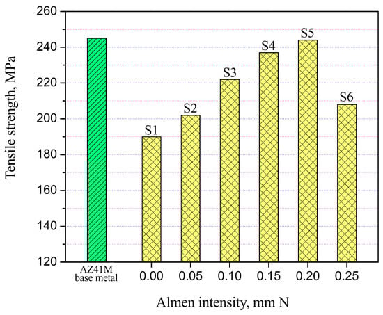 - With the increase in depth from the weld surface, the gradient variation of microhardness from 64 HV to 47 HV was obtained, attributed to the combined action of strain strengthening and grain refining. Compared with untreated joints, the tensile strength of Mg–steel specimens with optimal shot peening intensity of 0.20 mm N was notably enhanced and raised by about 28% to 244 MPa.