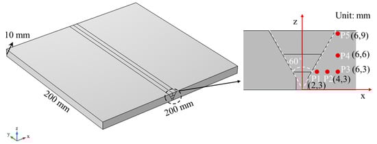 Figure 1 shows the geometrical model for welding simulation. The specific dimensions of the EH36 steel plate are 200 mm × 200 mm × 10 mm, and the welding is carried out along the y-direction at a speed of 2 mm/s. The model, constructed by COMSOL software version 6.2 by employing the birth and death method, is divided into 16,320 triangular prisms and utilizes a double-ellipsoidal heat source for the welding simulation. To quantitatively characterize the evolution of temperature, microstructure, and residual stress versus time, five points P1~P5 are chosen in the heat-affected zone, among which the two adjacent points of P1 to P3 are 2 mm apart along the horizontal direction, while the distance between subsequent points P3 to P5 is 3 mm along the vertical direction.