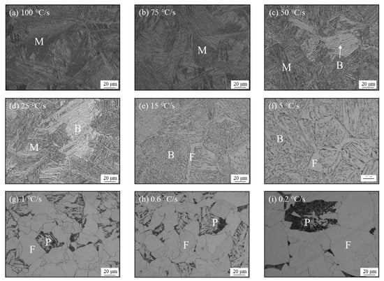 Microstructure morphology at several typical cooling rates (B: Bainite, F: Ferrite; P: Pearlite; M: Martensite).
