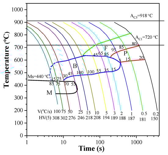 Based on the analysis of phase constituents and hardness measurements, we derived the Continuous Cooling Transformation (CCT) curve of EH36 steel, as presented in Figure 3. Under conditions of ultrafast cooling, the coarse-grained heat-affected zone (CGHAZ) undergoes a direct transformation into martensite. At a cooling rate of 50 K/s, bainite transformation commences at around 853 K, with the martensitic transformation occurring at 713 K and completing at approximately 513 K, producing the resultant microstructure comprising bainite and martensite. When the cooling rate decreases to 3 K/s, ferrite begins to form at about 973 K, followed by bainite transformation within temperature ranges from 883 K to 769 K. When the cooling rate is decreased to 0.2 K/s, the ferrite has enough time to nucleate and grow, within its transformation spanning 973 K to 1073 K, followed by the pearlite transformation within to 993 K to 863 K.