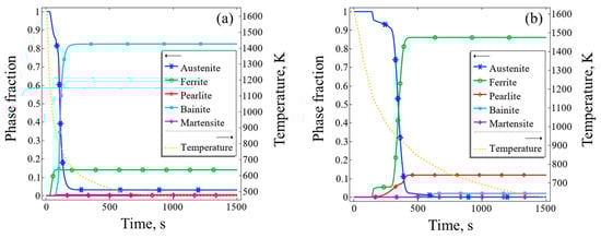 To estimate the accuracy of the current model that was established on the phase transformation parameters obtained from the SH-CCT curves, we first compare the numerical simulation results and experimental results from Fu et al. []. The simulated microstructure evolution under varying temperature histories is shown in Figure 4. With a heat input of 100 kJ/cm, the temperature drops from 1600 K to 480 K over 1500 s, resulting in a microstructure primarily composed of bainite and rest ferrite, without the presence of a martensitic transformation. Increasing the heat input to 250 kJ/cm results in a noticeable shift in the resultant microstructure including primary ferrite and pearlite. This great difference can be ascribed to the lower cooling rate upon a large heat input, which offers enough time for the diffusional ferrite and pearlite transformation, as also confirmed in Figure 2. The quantitative comparison of phase fractions between the simulation and experimental results is presented in Table 4. At both levels of heat input, the predicted values align closely with the empirical data, exhibiting a maximum deviation in the phase fraction of merely 5.5%.