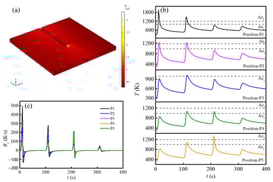 It is imperative that we scrutinize both the heating and cooling rates, as they exert pivotal impacts on the phase transformation kinetics. Figure 5c illustrates the heating and cooling rates at the five points, derived from the time derivative of the temperature. Point P1, located nearest the heat source, reaches the maximum heating and cooling rates of 500 K/s and 120 K/s, respectively. Both the peak heating rate and cooling rate decrease with the increase in the welding pass. The remaining points, lying further from the heat source, exhibit diminished peaks compared to P1, yet follow an analogous pattern of rate modulation. This intense fluctuation in the heating and cooling rate occurs only for a short period when the heat source sweeps over the location. As expected, this repeated thermal cycle strongly affects the phase transformation process.