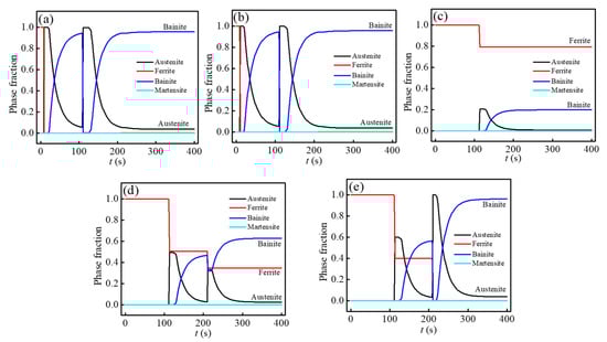 Figure 6 shows the microstructure variations at five distinct points within the heat-affected zone throughout the welding process. Points P1 and P2, which are in close proximity to the molten pool during the first two passes, demonstrate a similar pattern of microstructural evolution, as depicted in Figure 6a,b. During the initial two-pass welding (t < 200 s), the heating peak temperature surpasses Ac3, resulting in the transformation of the initial ferrite microstructure into a single austenite phase that subsequently decomposes into bainite upon cooling. P3, with its great distance from the heat source, is subjected to minimal thermal absorption. Only the peak temperature during the second pass reaches 1035 K (Figure 5b), surpassing Ac1. This results in a phase transformation during the second-pass welding, where approximately 20% of the ferrite phase transforms into austenite upon heating, followed by a transformation into bainite during cooling. As for P4, it is far from the heat source of the first pass but near the heat source of the second pass. Therefore, the phase transformation only commences from the second pass of welding, leading to the total generation of approximately 60% bainite during the two consecutive welding steps. However, since the maximum temperature does not reach Ac3, a small amount of the ferrite was retained. However, the temperature reached during the third welding exceeds the Ac3 point, which leads to a final microstructure that is chiefly composed of bainite, with a remaining portion of austenite.