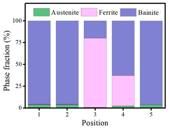 The final phase constituents at the five points are shown in Figure 7. At P1 and P2, it consists of bainite (>95%) and a small amount of austenite. Combined with Figure 6c,d, it can be seen that this is due to the large cooling rate in this region. However, near the starting temperature of Ms, the cooling rate decreases abruptly, preventing the formation of martensite (as is the case at other locations). Due to the low peak temperature at P3, only a few of the base phase is transformed into bainite with a volume fraction of 20%, and the ferrite phase occupies ~80% of the total volume. Along the height z-direction from P3 to P5, close to the weld region, the temperature change is greater, leading to more ferrite converting to austenite during warming. This results in a gradual decrease in ferrite content and a substantial amount of austenite decomposing to bainite during cooling, leading to a gradual increase in bainite content. The above study shows that the region close to the weld primarily consists of bainite with a small amount of residual austenite. In the region away from the weld, it is primarily composed of ferrite and bainite. It should be noted that the final microstructure after cooling is bainite during the multi-pass welding, as led by the high cooling rate.