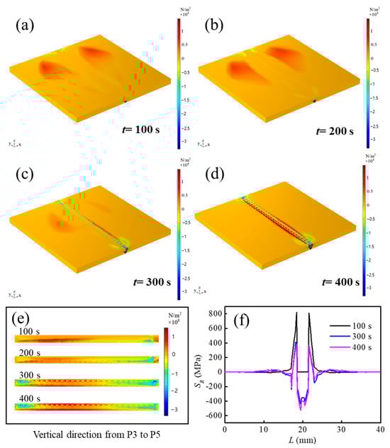 Regulation of residual stress by multi-pass welding: the three-dimension residual stress evolution at multi-pass welding time periods of (a) 100 s, (b) 200 s, (c) 300 s, and (d) 400 s; (e) residual stress distribution in the vertical section of the heat-affected zone; (f) residual stress distribution on special line segments.