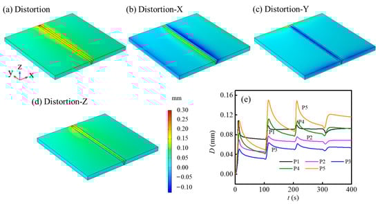 Effect of multi-pass welding on material distortion: material at 400 s: (a) total distortion, (b) X-direction, (c) Y-direction, (d) Z-direction, and (e) distortion at positions P1 to P5 versus time.
