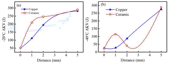 Figure 10 shows the low-temperature impact toughness at various locations on the EH36 steel plate, examined under two different post-welding cooling rates, while maintaining the equivalent line energy. The comparative cooling methods included a water-cooled copper backing plate and ceramic backing plate. Figure 10a shows that the cooling method with ceramic backing slightly surpasses the water-cooled counterpart at 253 K, resulting in an overall higher impact toughness compared to the water-cooled copper backing method. Notably, this improvement is more distinctly emphasized at distances of 1 mm and 2 mm from the weld’s fusion boundary. It can be deduced that reducing the cooling rate is beneficial for improving the low-temperature impact toughness within the heat-affected zone. With the increased distance from the weld pool line, the cooling rate during multi-pass welding gradually decreases, leading to the formation of more acicular ferrite rather than bainite, as shown in Figure 2, Figure 5, Figure 6 and Figure 7, which, in turn, leads to an improvement in impact toughness. A similar phenomenon has been reported in the literature []. The dissimilarity in impact toughness attributable to the two cooling modalities at the fusion line and the 5 mm demarcation is negligible, as the toughness in these zones predominantly stems from the interaction between the weld metal and the foundational material. At 233 K, the steel approaches the brittle transition temperature, which leads to a broader scatter in the data, rendering the results less definitive. Additionally, the alleviation of residual stress observed during multi-pass welding and with the increased distance from the fusion line, as depicted in Figure 8, could also contribute to the improved impact toughness.