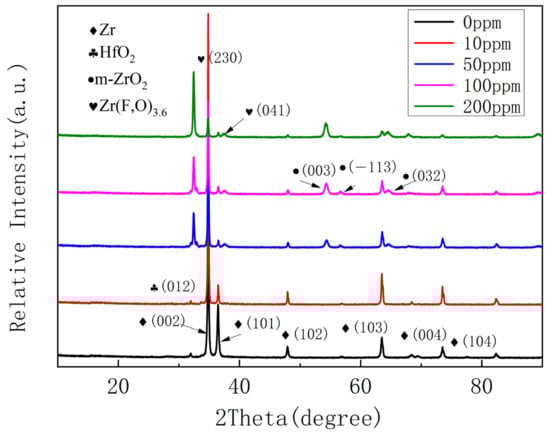 The structural characteristics of the Zr702 specimens in 6 M HNO3 containing NaF after the specimens were subjected to corrosion tests are illustrated in Figure 2. According to the JCPDS PDF05-0665 card, the diffraction peaks at 2θ = 34.9°, 36.5°, 47.99°, 63.54°, 73.45°, and 82.44°corresponding to the (002), (101), (102), (103), (004), and (104) planes, of Zr, respectively. According to the JCPDS PDF49-1746 card, the diffraction peaks at 2θ = 54.4°, 57.1°, and 64.6° correspond to the m-ZrO2 (002), (040), and (122) planes of monoclinic zirconium oxide (m-ZrO2), respectively [11]. It has been observed that ZrO2 mostly comprises m-ZrO2. The diffraction peaks at 2θ = 32.0° correspond to the (012) plane of HfO2 according to PDF 40-1173. The diffraction peaks at 2θ = 32.4°and 37.6° correspond to the (230) and (041) planes of Zr (F, O)3.6 according to PDF40-1096. The XRD patterns of specimens without any F− and with 10 ppm F− show diffraction peaks of α-Zr along with a few HfO2 phases. XRD diffraction patterns of specimens with 50 ppm F−, 100 ppm, and 200 ppm F− show diffraction peaks of α-Zr, m-ZrO2, and Zr (F, O)3.6. (Figure 2). With an increase in F− concentration, the corrosion products on the ZrO2 specimen surfaces change from HfO2 to a mixture of ZrO2 and Zr (F, O)3.6, and the diffraction peak of the corrosion products becomes stronger and stronger, while the diffraction peak of Zr becomes weaker. Furthermore, several previous researchers had observed two ZrO2 structures, namely, m–ZrO2 and t–ZrO2, when the Zr and Zr alloy were immersed in boiling nitric acid, with m–ZrO2, more stable than t–ZrO2, as the dominant compound [20,21,22,23,24]. However, t–ZrO2 was not detected in this study.