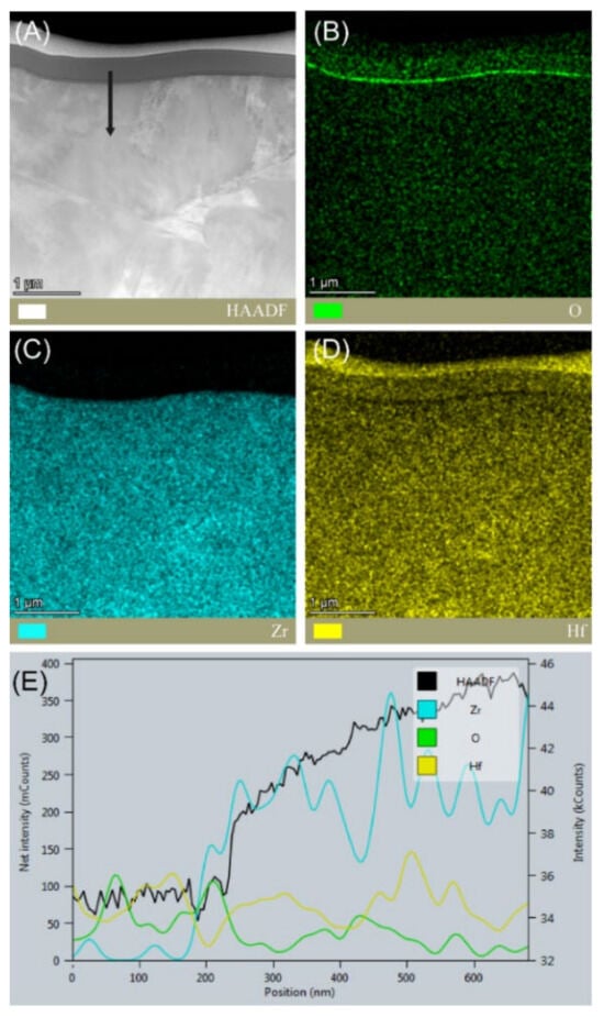 Figure 3 shows the HAADF-STEM image of the specimens immersed in a boiling 6 M HNO3 solution with an F-concentration of 10 ppm subjected to corrosion for 240 h and the corresponding EDX maps of O, Zr, and Hf. Figure 3A shows the HAADF-STEM image, while Figure 3B–D show the EDX analytical maps of O, Zr, and Hf. Figure 4e shows the EDX line scan profiles of the three elements O, Zr, and Hf. The corroded oxide layer comprised an outermost layer of HfO2 and a sub-outer layer of ZrO2.