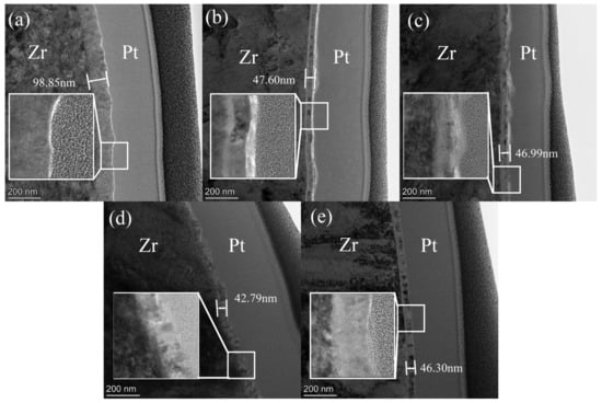 Figure 4a–e show the representative cross-sectional TEM images of the oxide films on the specimen surfaces after being subjected to 240 h of corrosion in boiling 6 M HNO3 and fluorinated nitric acid with different F-concentrations. The oxide film formed between Zr702 and platinum was homogeneously distributed. As shown in Figure 4a, ~98.85 nm thick oxide layer is present in the specimen immersed in the F-free HNO3 solution. The oxide layers of the specimens in HNO3 solution with 10,50,100, and 200 ppm F− concentrations shown in Figure 4b–e, respectively, are 42–48 nm in thickness, and thus they are much thinner than the oxide layer formed in the specimen immersed in the F− free HNO3 solution. The HfO2 layers, as shown in Figure 4a,b (white edge position) on Zr702 in 0 ppm and 10 ppm test samples after 240 h of the immersion test were 6 nm and 15 nm, respectively, and the HfO2 layer was uniform and continuous, which had a good protective effect for the HNO3 solutions. However, the HfO2 layer in the 50,100 and 200 ppm test samples, after 240 h of the immersion test, began to be discontinuous due to partial dissolution, as the enlarged images of the oxide film show. At 10 ppm, a continuous hafnium oxide film can be seen to protect Zr702. At 50 ppm, the film begins to dissolve and become discontinuous. When the concentration increases to 100 ppm, the boundary is blurred, the corrosion is intensified, the ion channel is formed, and the zirconia film begins to corrode. At 200 ppm, the oxide film almost disappears and completely dissolves. These TEM observations confirm that the oxide film thickness decreased as the F− content in the HNO3 solution increased.