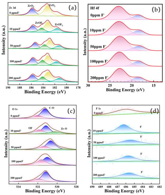 To further investigate the chemical states of the films formed on the surfaces of the Zr702 specimens after they were exposed to corrosion for 240 h, high-resolution XPS spectra shown in Figure 5 were obtained. In Figure 5a, 50 ppm peaks in fluorinated nitric acid at 183.0 and 185.3 eV were assigned to the Zr4+ 3d3/2 and Zr4+ 3d5/2 electrons in ZrO2 and ZrF4 [25,26,27]. The 0 ppm peaks in fluoride-free nitric acid at 185.9 and 183.5 eV originate from ZrO2, which is in line with the values provided by J. Jayaraj [7]. The peaks at 10 ppm, 100 ppm, and 200 ppm in the spectrum of fluorinated nitric acid are ascribed to ZrF4 and ZrO2. In Figure 5b, a peak of Hf 4f is present in all five samples; the peaks obtained at 17.8 and 22.8 eV correspond to the Hf 4+ 4f 3/2 electrons in HfO2 and Hf 4+ 4f 3/2 electrons in HfF4, respectively [28,29]. Furthermore, as can be seen in Figure 5c, the 50 ppm peaks in fluorinated nitric acid at 531.4 eV are ascribed to O1s in ZrO2. The peaks of 50 ppm in fluorinated nitric acid at 530.4 eV were assigned to the O1s electrons in HfO2. In Figure 5d, the 10-ppm peak in the fluorinated nitric acid at 686.2 eV was assigned to the F1s electrons, which proved the bond between F–Zr and F–Hf, indicating the presence of ZrF4 [7,30,31] and HfF4. However, the F1s peak is not present in the other four specimens. Thus, it can be concluded that Zr forms a normal ZrO2 passive film when immersed in nitric acid solutions, whereas in solutions containing NaF, the corrosion product ZrF4 film replaces ZrO2. The incorporation of F− ions into the oxide film and the presence of ZrF4 and HfF4 indicate that the fluoride ions are responsible for the dissolution of the oxide film of Zr702 when exposed to fluorinated nitric acid. Similar results were observed in the document [6].
