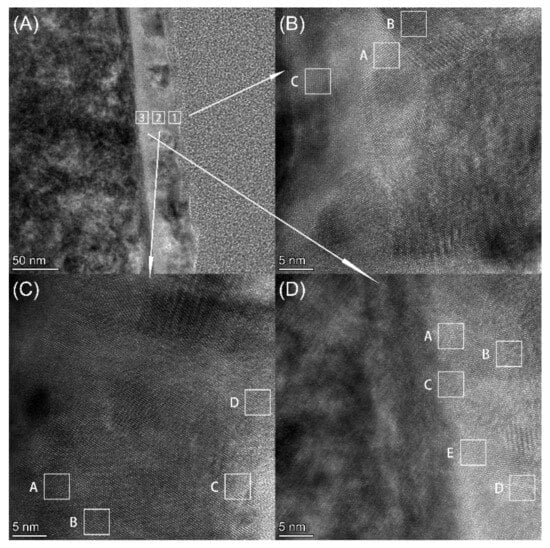HRTEM images of three different zones in oxide films of the specimens immersed in HNO3 solutions with 200 ppm F− for 240 h (A) outer layer 1# zone, (B) middle layer 2# zone, and (C) inner layer 3# zone (D).