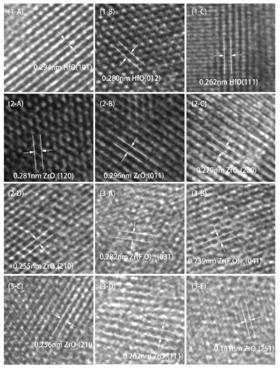 To further investigate the microstructures of the oxide films, these specimens were photographed with a subregional high-resolution phase, and the results are shown in Figure 6 and Figure 7. Figure 6 shows the HRTEM images taken from three different zones of the oxide films of the specimens immersed in a HNO3 solution with 200 ppm F− for 240 h. As shown in Figure 6A, the oxide layer has a nanocrystalline cluster. Figure 7 shows the magnified view of the high-resolution phases shown in Figure 6. As shown in Figure 7(1-A~1-C), the outermost 1# region of the oxide layer corresponds to the (101), (012), and (111) crystal planes of HfO2, respectively. The Figure 7(2-A~2-D) in the 2# region correspond to the (120), (011), (200), and (210) crystal planes of ZrO2, respectively. The Figure 7(3-A~3-E) in the 3# region correspond to the (031) and (041) crystal planes of Zr (F, O) 3.6, and (210), (111), and (251) of crystal planes of ZrO2, respectively.
