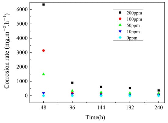 - When the concentration of fluoride ions changes from 0 ppm to 200 ppm, the corrosion rate at the concentration of fluorine ions at 0 ppm and 10 ppm basically remains unchanged within five time periods, while the corrosion rate at 50 ppm to 200 ppm shows a downward trend with the increase of time. The most obvious change is at 48 h when the concentration of fluoride ions increases, the higher the corrosion rate.