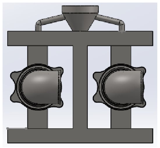 Figure 6 shows the simulation results of casting flaws. The figure indicates that shrinkage holes are the primary flaws at the corners of the casting system and at the riser–cross-gate connections. There is comparable shrinkage in both castings, mostly on the flanges, in terms of both place and proportion. However, a small amount of shrinkage was observed at the straight pipes and elbows. Calculations reveal that the total volume of shrinkage inside both castings amounts to approximately 2.12 cc, with each casting having around 1.06 cc.