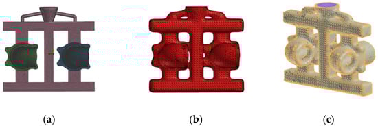 Face and body meshing of the 3D group tree model of the pouring system: (a) Meshing of castings; (b) Shell face meshing; (c) Mesh division of castings and molded shells.