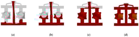 Simulation of the filling process of the exhaust elbow: (a) 25% of the charge; (b) 50% of the charge; (c) 75% of the charge; (d) 98% of the charge.