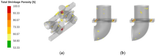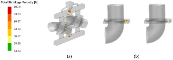 Exhaust elbow shrinkage distribution results: (a) Shrinkage distribution with casting system; (b) Distribution of shrinkage in castings without pouring system.