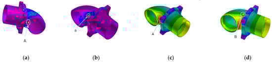 Thermal cracking tendency diagram and effective stress of exhaust pipe casting: (a) Exhaust pipe bend maximum position HTI value: 0.000163; (b) Maximum position of exhaust elbow HTI: 0.000760; (c) Effective stress at area A: 439.5 MPa; (d) Effective stress at area B: 258 MPa.