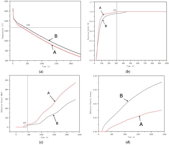 Dynamic changes in mechanical behavior at specific regions A and B on the exhaust bend with optimal process parameters: (a) Temperature–Time; (b) Fraction Solid Rate–Time; (c) Effective stress–Time; (d) Effective Plastic Stress–time.