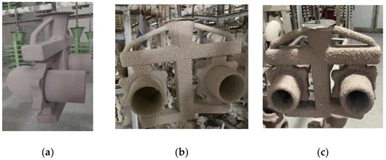 Comparison of different process parameters: (a) Traditional machining–welding process; (b) Initial casting process parameters castings; (c) Optimized process parameters castings.
