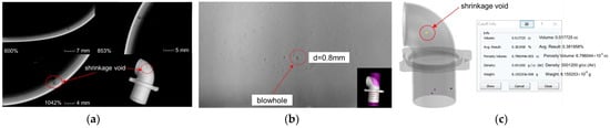 CT inspection results of exhaust elbow castings under initial pouring process parameters: (a) Shrinkage of bent pipe sections; (b) Dimensions of blowhole defects in straight sections; (c) (Analogue) Bend section corresponding to shrinkage position.