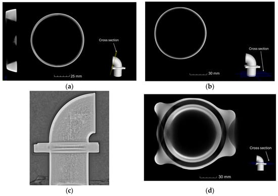 CT section of exhaust elbow for casting scheme with optimized process parameters: (a) Transverse section of a bend section of pipe; (b) Transverse section of a straight section of pipe; (c) DR result; (d) Transverse section of flange.