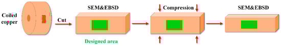 A high purity Cu (99.9999 wt.%) sheet was annealed at 805 °C for 2 h to achieve a fully recrystallized microstructure before deformation. A block of 7 mm × 6 mm × 6 mm specimen was cut from the Cu sheet, and its transverse direction (TD) plane was carefully polished with sandpaper, followed by an electropolishing using a mixture of nitric acid, alcohol, and distilled water (1:1:2 by volume) at room temperature for 0.5 min. The copper strips used for lead frames are still mainly produced by rolling, and in the early rolling process, compression dominates due to process efficiency. Therefore, compression was chosen as the main deformation method in this study, to closely mimic actual production conditions. The compression experiment was carried out on a Shimadzu AG-X (50 kN) machine at room temperature and at an equivalent initial strain rate of ~10−3 s−1, until a thickness reduction of 5.25%. The specific process route is shown in Figure 1.