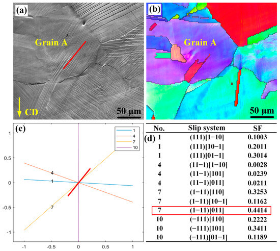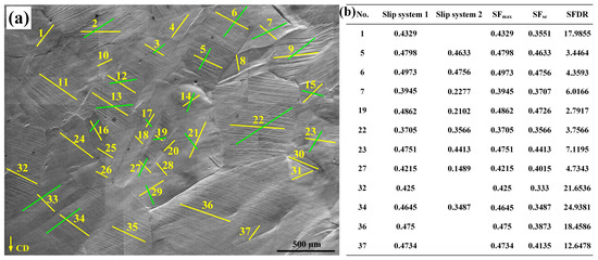 As shown in Figure 9, numerous slip traces appeared in the grains. The specific type of slip can be determined through the slip trace analysis method, and the SFs of the corresponding slip systems could be subsequently calculated using crystallographic computations (as explained in Section 2.2). Essentially, the SF reflects the probability of a certain type of slip system being activated under the conditions of a specific stress direction and crystallographic orientation.