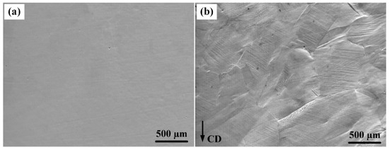 Figure 3a,b show the microstructure of the specimen before and after the compression, respectively. The compression process led to a transition from a smooth surface to an uneven pattern, and most grains can be readily distinguished by their outlines (Figure 3b). Upon close inspection of Figure 3b, numerous slip traces are observed within the grains, with different grains displaying distinct trace morphologies, including direction, density, and combination type. Figure 3b depicts the occurrence of multiple slip traces in certain regions. These multiple slip traces are not uniformly distributed across the entire grain but are confined to specific parts of the grain.