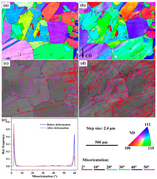It is important to note that no new twin structures were identified during the compression process, a fact corroborated by the misorientation distribution analysis. The misorientation evolution maps, as depicted in Figure 4c,d, illustrate various misorientation degrees using different colors. Upon closer examination of the misorientation degree, it becomes apparent that prior to compression, most grain boundaries exhibited misorientations larger than 40° (shown in blue color). However, after compression, many low-angle grain boundaries appeared within the grains, particularly at the original grain boundaries. This observation is further supported by the misorientation spectrum.