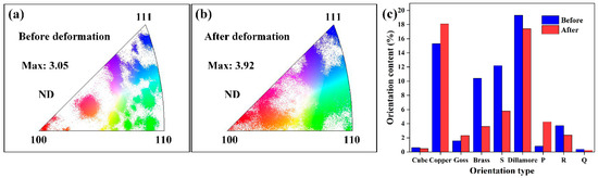 Figure 5a,b illustrate the texture evolution before and after compression via inverse pole figures. Before compression, the orientations tended to cluster in specific regions, while after compression, these orientations were noticeably dispersed, nearly filling the entire inverse pole figure, as depicted in Figure 4b. The increased orientation dispersion, to a certain extent, mirrored the splitting of original grains and the formation of substructures. Consequently, the maximal orientation density increased from 3.05 to 3.92 after compression. Here, the tolerance angle used to define the different texture components was 15°.