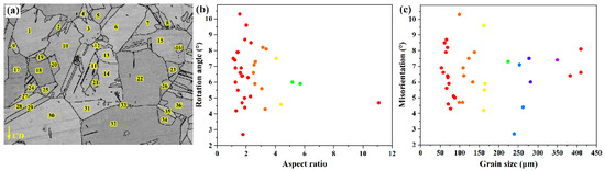 In Figure 6a, a grain boundary map is presented, with most grains numbered sequentially throughout the thickness. Subsequently, the misorientation of orientations (36 points in total) before and after compression was extracted and calculated for each numbered grain. This misorientation, which essentially represents the degree of rotation for each grain during compression, was then analyzed. As illustrated in Figure 6b,c, the degree of rotation did not display a conspicuous linear relationship with either grain aspect ratio or grain size. Instead, the rotation degree points tended to concentrate within the aspect ratio range of 1–3 and the grain size range of 50–100 µm.