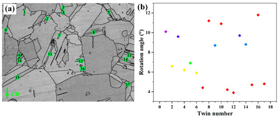 To address this question, 17 twins were identified and designated within the testing region, as depicted in Figure 7a. The degree of rotation fell within the range of 4.2 to 11.8 degrees, which was lower than that observed in the grains, as analyzed in Figure 6. It is worth noting that this rotation measurement only applied to twins with undamaged morphology and a high recognition degree; some other twins at the edge of the scanning field or of very small size were excluded from the count to ensure the accuracy of the analysis.