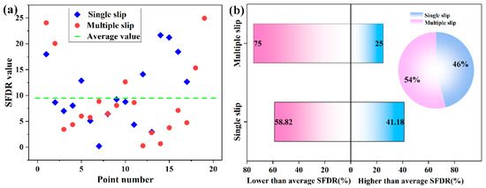 As shown in Figure 10a, the SFDR of the testing points (37 points in total) were scattered successively with a wide range of 0.2185–24.9381, and the average SFDR was 9.5071. Figure 9b reveals that 54% of these points exhibited evidence of multiple slipping deformations, while the remainder displayed single slipping deformation. Close inspection of Figure 10b shows that 75% points were lower than the average SFDR during multiple slipping deformation, while the percent was 58.82% in single slipping deformation. This suggests that lower SFDR values are more inclined to trigger the activation of multiple slip systems during the deformation process. To explore this observation further, the testing region was reconstructed based on the SFDR value, and a comparison was made with the orientation imaging map and SEM maps, to further investigate this phenomenon.