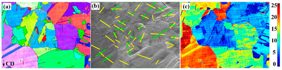 As illustrated in Figure 9a, the deformation of grains was accomplished through the activation of slip systems. Some grains displayed two types of slip traces. The yellow line signifies the first slip system, while the green line corresponds to the second. It should be noted here that first and second has nothing to do with the order of the slip system activation, and those two lines here were artificially defined for ease of distinction. Close inspection of Figure 9a shows that the activation of a single or multiple slip system had no obvious relationship with the size or aspect ratio of grains.