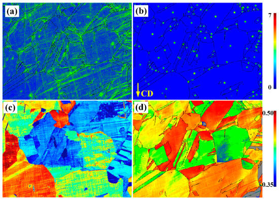Upon close examination of Figure 8a, it becomes apparent that the peak morphology of the band contrast spectrum, including both height and width, exhibited a distinct orientation dependence. Notably, the Q orientation peak displayed a noticeable broadening. Moreover, there was a significant contrast in the estimated stored energy values among grains of different orientations, with the maximum discrepancy reaching as high as 1.331. Specifically, the maximum stored energy measured 7.8125 for the Q orientation, while the minimum was 6.4815 for the S orientation. In essence, this orientation-dependent stored energy arose from the disparate distribution of dislocation content, with the crystallographic orientation of grains playing a pivotal role in governing the initiation and progression of dislocations.